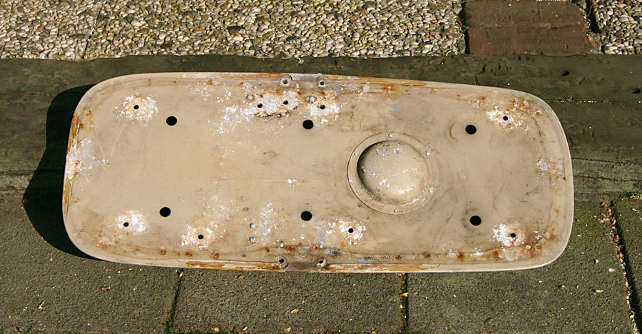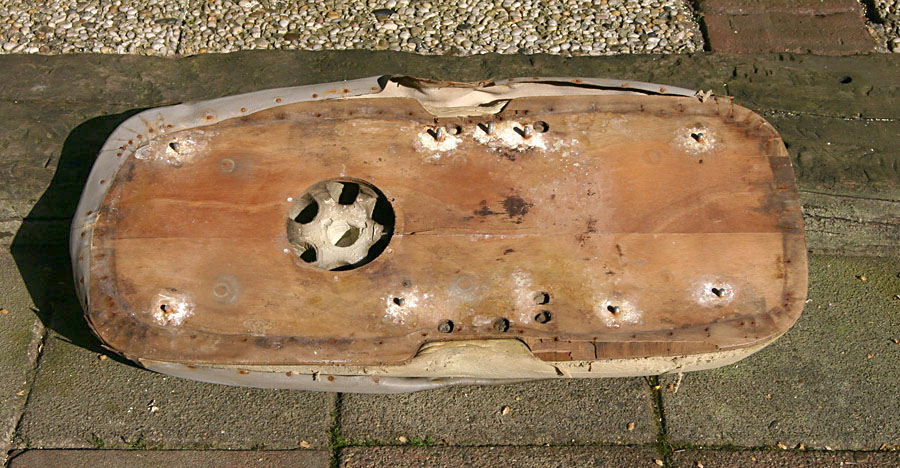 Bij het loshalen van de metalen plaat bleek de houten basisplaat verrot te zijn en viel bij aanraking uitelkaar. Ook zat er schimmel tussen. De metalen plaat had ook wat roestplekjes.