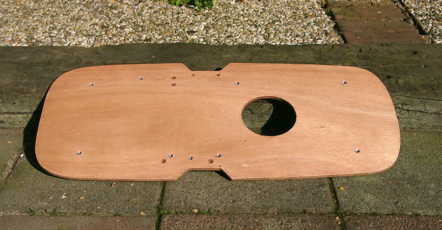 | Er werd een nieuwe houten basisplaat gemaakt van 8 mm waterbestendig multiplex. De plaat werd in de juiste vorm gezaagd, de ronde uitsparing voor de tankdop eruit gezaagd en kleine uitsparingen gemaakt voor de nokjes die in de metalen plaat zitten. Daarna werd de plaat gelakt.